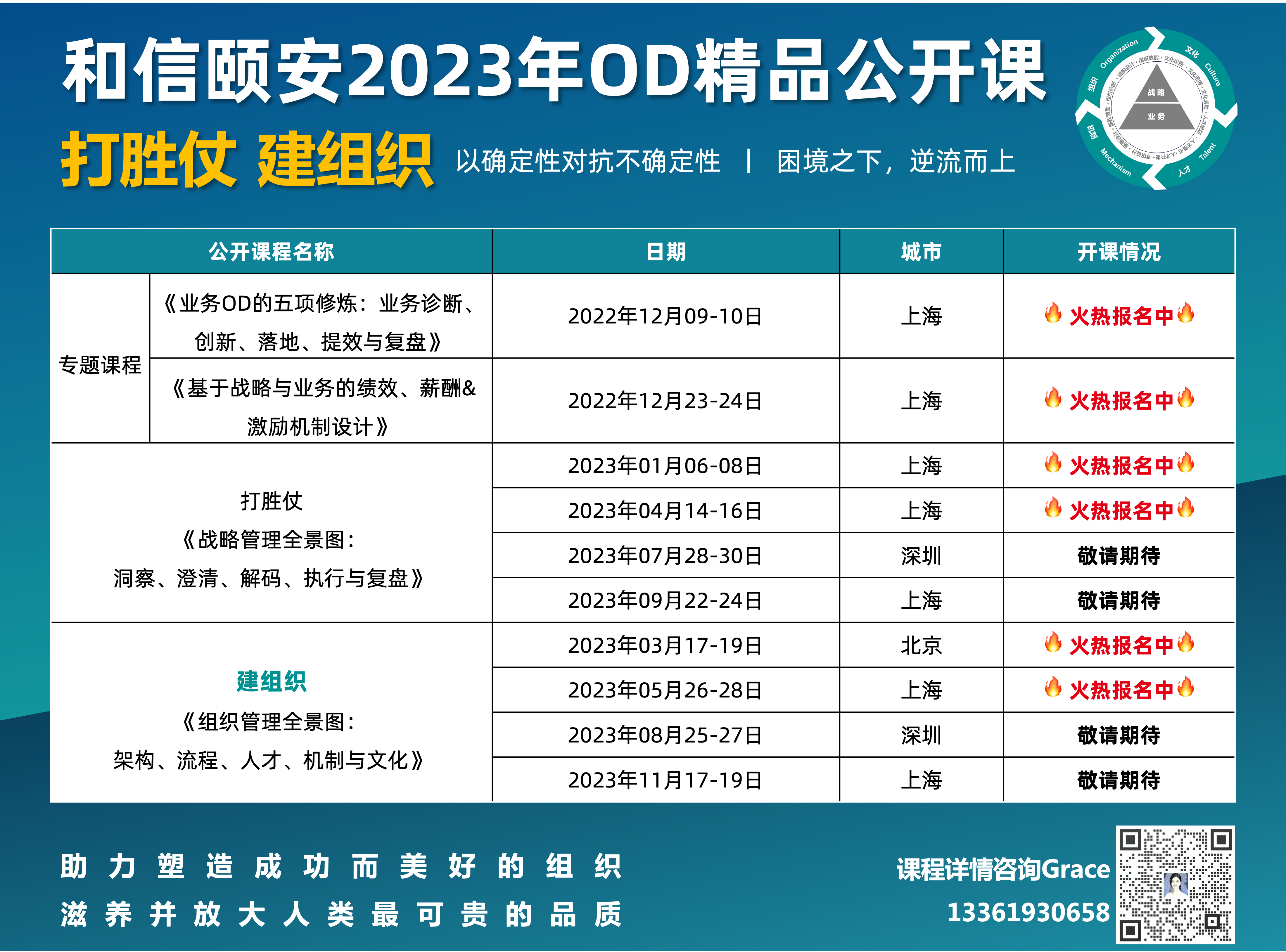 和信颐安OD课程体系,是在对客户需求的精准洞察,对课程品质的执着坚守,对价值创造理想的坚持的基础上设计的。和信颐安从OD角色所面临的组织系统差异、利益相关者的不同以及对OD专业方法的理解深度与掌握程度等方面进行了课程体系的设计,形成了以战略与业务为核心,以架构、机制、人才、文化为支撑的2+4课程体系,如下图所示:和信颐安以“助力塑造成功而美好的组织,滋养并放大人类最可贵的品质”为使命,以培养组织发展高手为已任:连续6年推出组织发展系列精品公开课,并在上海、北京、深圳、广州4地循环开课超过3300多人/次学习。自2018年起,已有40%的学员成功转型至OD总监、HRVP等岗位,为行业输出了一批高质量的人才,和信颐安已成为OD人才的摇篮。